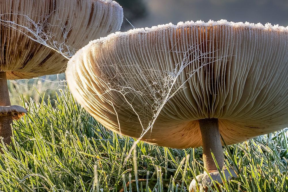Morning Glow est un portrait de deux grands champignons Parasol par une froide matinée dans le Veluwe. Vous pouvez sentir l'immobilité, le silence et le froid dans la photo, jusqu'à ce qu'un moment plus tard, le soleil se lève et la scène disparaît dans la chaleur.