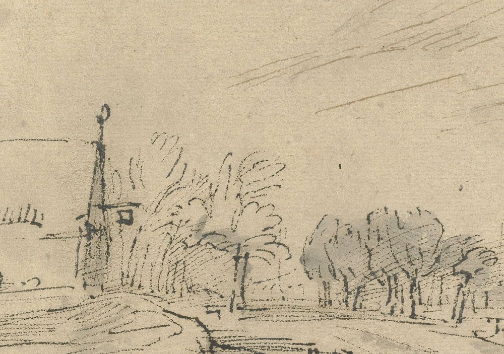 plume et encre noire, sur papier brun clair ; ajouts ultérieurs avec pinceau à l'encre grise et plume à l'encre brune ; lignes d'encadrement à l'encre brune, h 141mm × l 200mm
