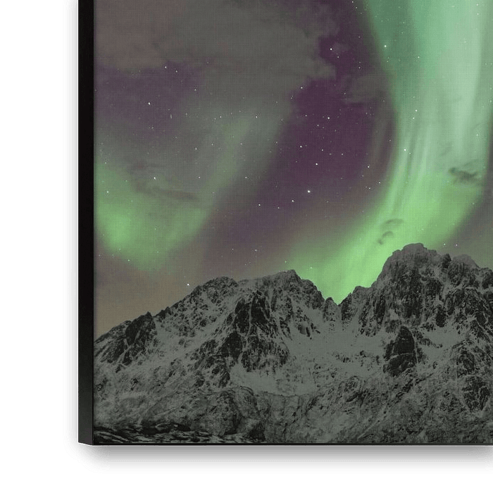 Aurore boréale ou lumière polaire dans le ciel nocturne des îles Lofoten, au nord de la Norvège. Un faisceau clair s'élève des hauts sommets couverts de neige et de glace au loin.