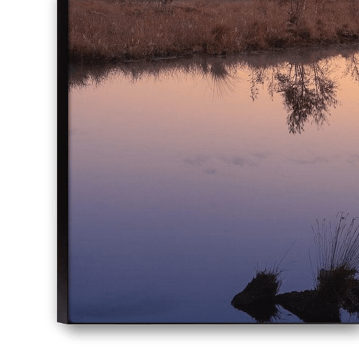 Une belle photo d'une tourbière de Drenthe sur le Dwingelderveld, par un matin sans vent et brumeux. Juste avant le lever du soleil, avec de belles couleurs dans le ciel. Les arbres se reflètent dans l'eau. Tout comme les nuages. La photo a été prise le matin du 25 septembre 2022, au Dwingelderveld en Drenthe.