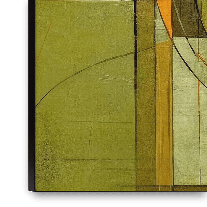 Peinture abstraite dans des tons principalement vert olive et orange sur le thème du cubisme et de l'avocat.
