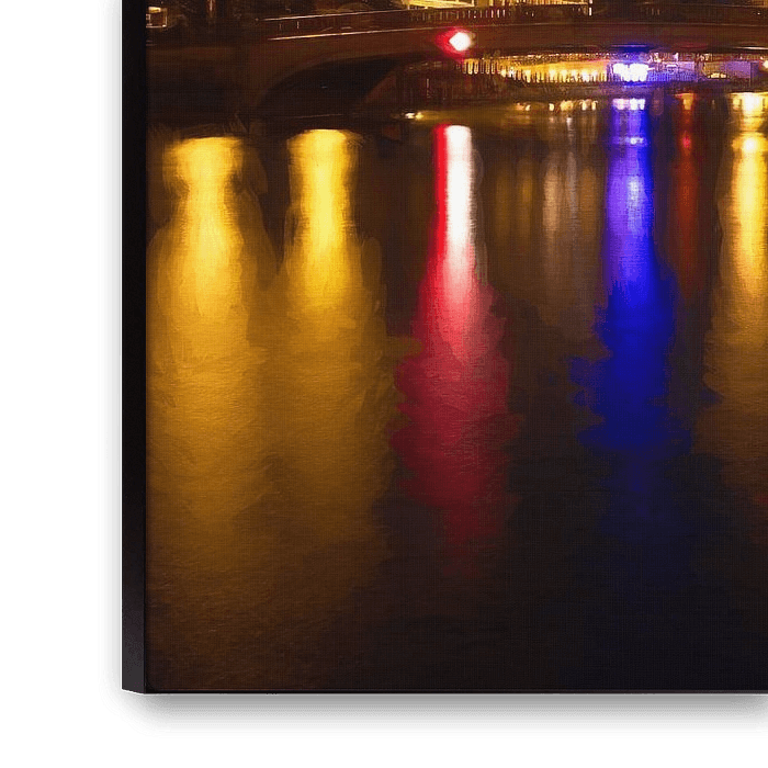 Des lumières colorées créent un beau reflet dans la Spree. Un traitement ultérieur de l'image, inspiré de la peinture à l'huile, a permis d'obtenir un effet pictural.