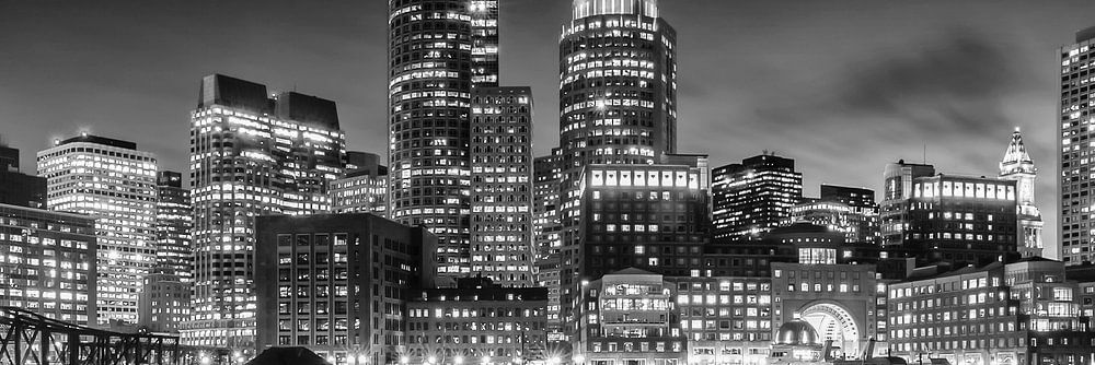 Une vue enchanteresse de la ligne d'horizon illuminée de Boston depuis le Fan Pier Park. Une atmosphère nocturne impressionnante à l'heure bleue.