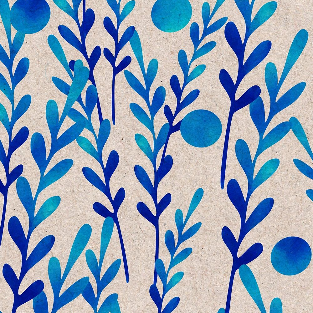 Illustration botanique de style rétro avec des feuilles bleues et des baies stylisées.