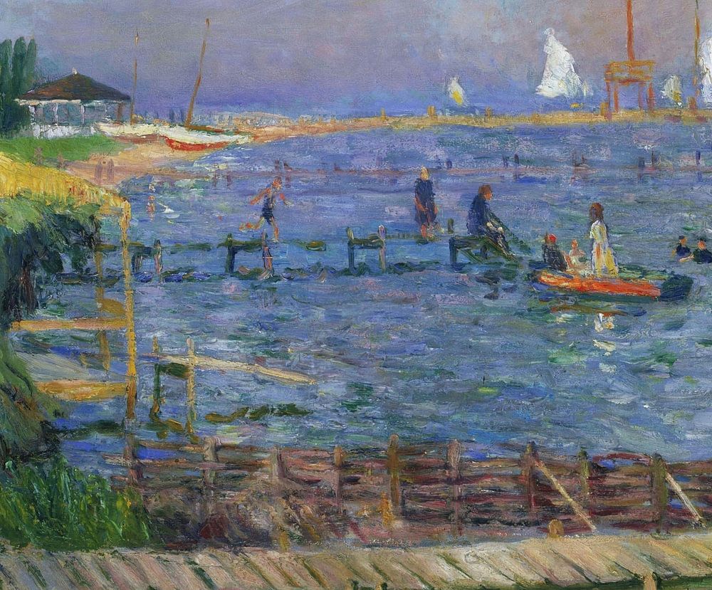 Glackens passe les étés entre 1911 et 1916 à Bellport, Long Island, une communauté tranquille et préservée qui attire les artistes, les écrivains et les musiciens. Il y peint une série de scènes de plage - des toiles vibrantes qui s'éloignent de ses œuvres sombres et mornes des années précédentes. Pendant les étés à Bellport, Glackens a peint de nombreuses œuvres à Great South Bay qui montraient sa famille et ses amis profitant des plaisirs de l'été - le soleil et la plage, la voile et la natation. Dans Bathers at Bellport, des quais horizontaux et des barres de sable délimitent l'eau bleue étincelante ; des maisons de bain jaune ocre vif et terre de sienne brûlée contrastent avec des voiles d'un blanc éclatant. Mémoire visuelle de l'été 1912, cette œuvre révèle l'intérêt croissant de Glackens pour l'impressionnisme et sa compréhension de l'influence importante de l'art français sur l'art américain. La clarté des couleurs tirées de la nature, si caractéristique de l'impressionnisme français, a clairement touché une corde sensible chez Glackens. Bathers at Bellport rappelle les peintures de Claude Monet des années 1860 par le traitement large et direct de la couleur, la brièveté de la touche et les touches de pigments semblables à des bijoux qui dénotent le feuillage et le reflet chatoyant du soleil sur l'eau.