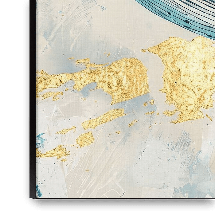 Cette œuvre d'art représente une élégante baleine flottant dans un monde abstrait de bleu et d'or. La baleine, rendue dans de riches nuances de bleu, est accentuée par de délicates lignes blanches qui soulignent sa forme et son mouvement.