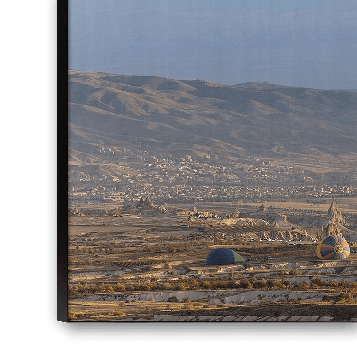 L'image montre le paysage époustouflant de la Cappadoce, connue pour ses étranges formations de tuf et ses champs aux couleurs vives. À l'aube, des montgolfières élégamment colorées s'élèvent dans le ciel d'un bleu éclatant, tandis que les couleurs chaudes du soleil levant baignent la scène d'une lumière magique. Les douces collines et les "cheminées de fées" uniques en leur genre en arrière-plan confèrent à l'image une atmosphère de rêve qui plonge le spectateur dans la beauté pittoresque de cette région fascinante.