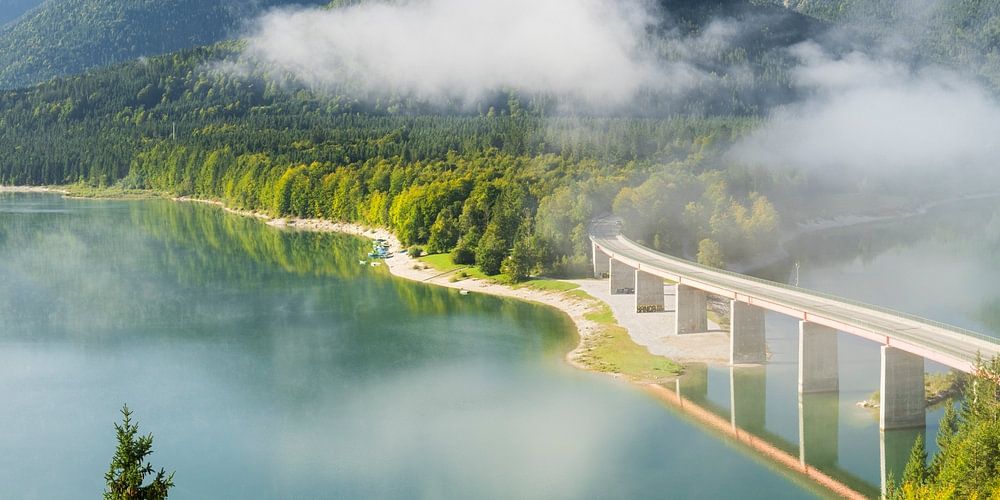 Pont sur le lac de barrage de Sylvenstein, Isarwinkel, Bavière, Allemagne