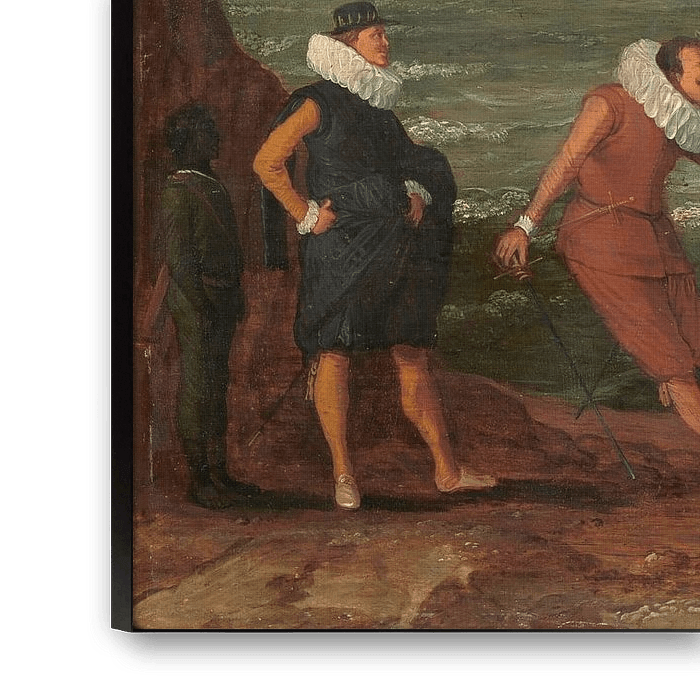 Deux gentilshommes se disputent le contrôle d'un bâton en or. Il symbolise la domination des mers du monde. En effet, celui qui domine la mer contrôle le commerce, mendie ses ennemis et s'enrichit lui-même. L'homme de droite représente les Pays-Bas, celui de gauche l'Espagne. Les hommes à côté d'eux, qui représentent l'Angleterre et Venise, entre autres nations, regardent la scène avec suspense. La scène à l'arrière-plan, la victoire navale de la République à Gibraltar en 1607, semble prédire qui triomphera.