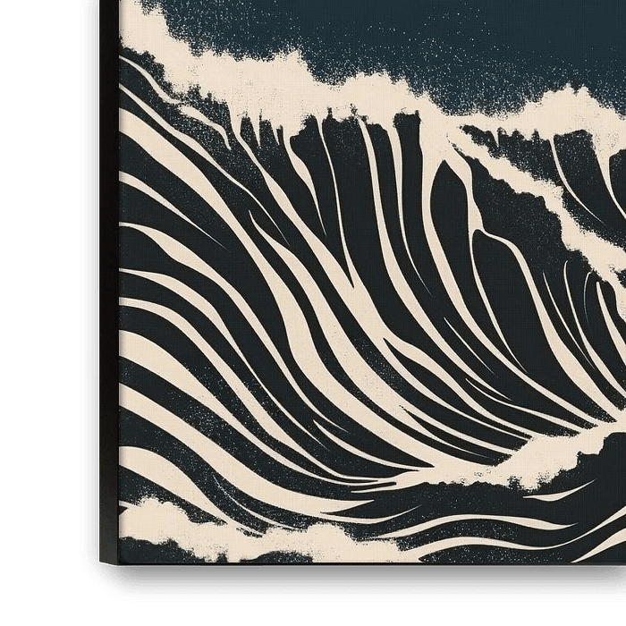 Une illustration vintage minimaliste avec de grandes vagues, un fond sombre, une impression en risographie, un soleil rouge au-dessus de la mer, des lignes simples et des formes géométriques inspirées des gravures sur bois japonaises. Le design utilise uniquement les couleurs noir, blanc et orange. Il a un rayonnement élégant et mise sur de forts contrastes d'ombre et de lumière. Au centre se trouve un grand motif de vagues blanches qui occupe les deux cinquièmes de l'ensemble de l'image. Ce motif rappelle les ondulations de l'eau ou les dunes de sable. Un chef-d'œuvre dans le style des artistes japonais de la gravure sur bois.