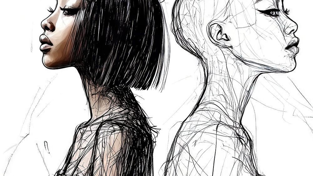 Vue latérale d'un beau mannequin de mode noir avec une coiffure au carré, posant à côté de l'esquisse de son portrait. L'image montre le processus créatif du dessin du début à la fin de l'œuvre d'art, réunissant la mode et l'art dans une représentation unique.