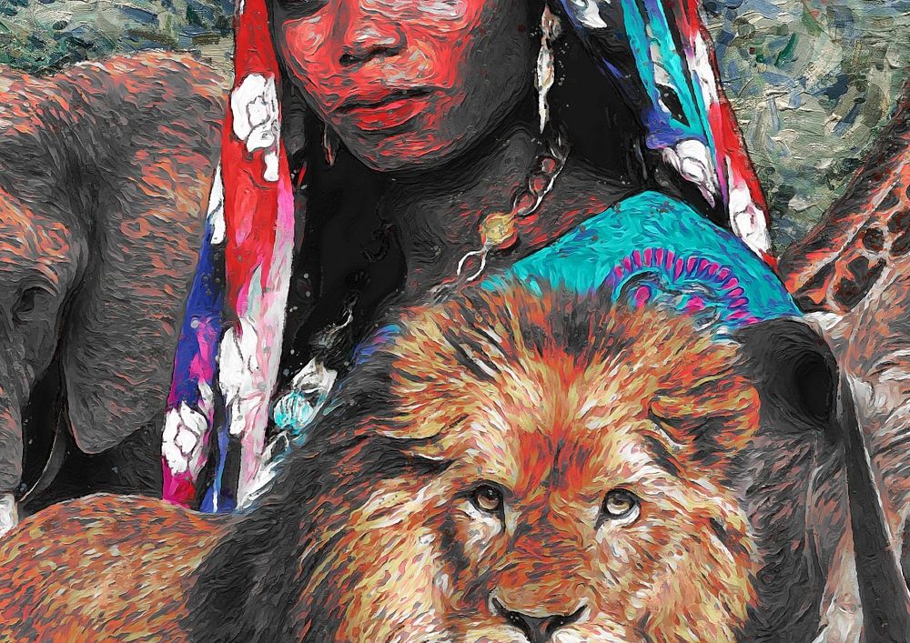 Le lion, le rhinocéros, la girafe et l'éléphant sont caractéristiques de l'Afrique et la femme africaine dans ses belles couleurs me rappelle un peu Mère Nature.