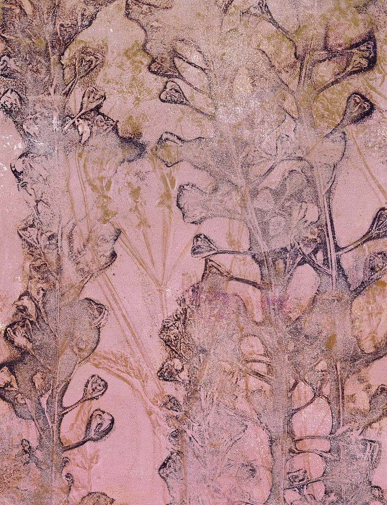 Technique mixte - impression monotype de feuilles, de plantes, de fleurs et de textures abstraites.