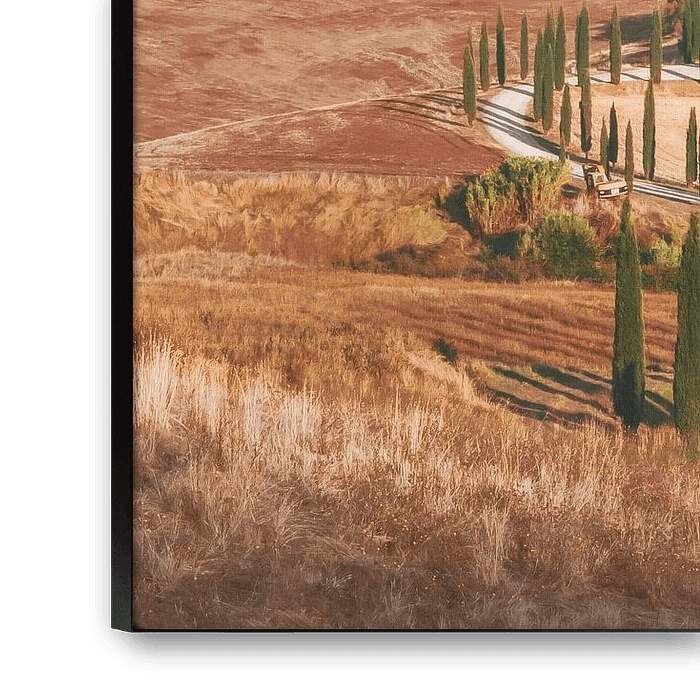 Cette œuvre d'art représente une route traversant des cyprès typiques et les collines ondulantes du Val d'Orcia, en Toscane, capturée au lever du soleil. Des lignes douces et des formes fluides donnent vie au paysage toscan caractéristique, tandis que la palette de couleurs montre la lueur chaude de la lumière du matin. L'atmosphère pittoresque crée le calme et l'immobilité.