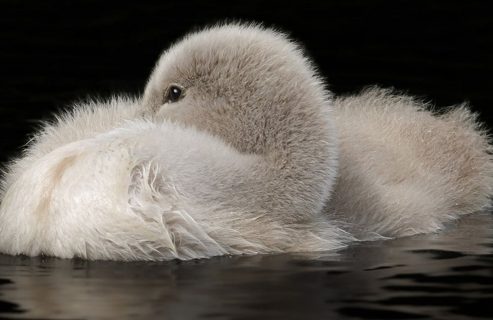 Les réglages manuels de l'appareil photo ont permis de créer cet arrière-plan sombre. Ce qui fait ressortir encore plus le doux duvet gris du cygne. On dirait une pelote de laine duveteuse avec un bec et des pattes.