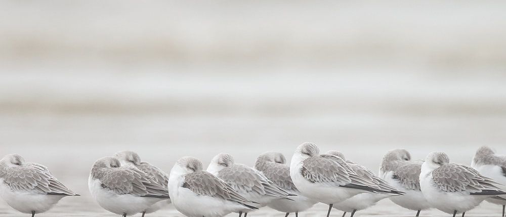 En hiver, les bécasseaux sanderling viennent du nord vers le sud. Sur nos plages, on les voit en grand nombre le long de la ligne de marée à la recherche de nourriture. Avec le fort vent froid, ils se tiennent souvent en rang ou en groupe afin d'être protégés du froid.