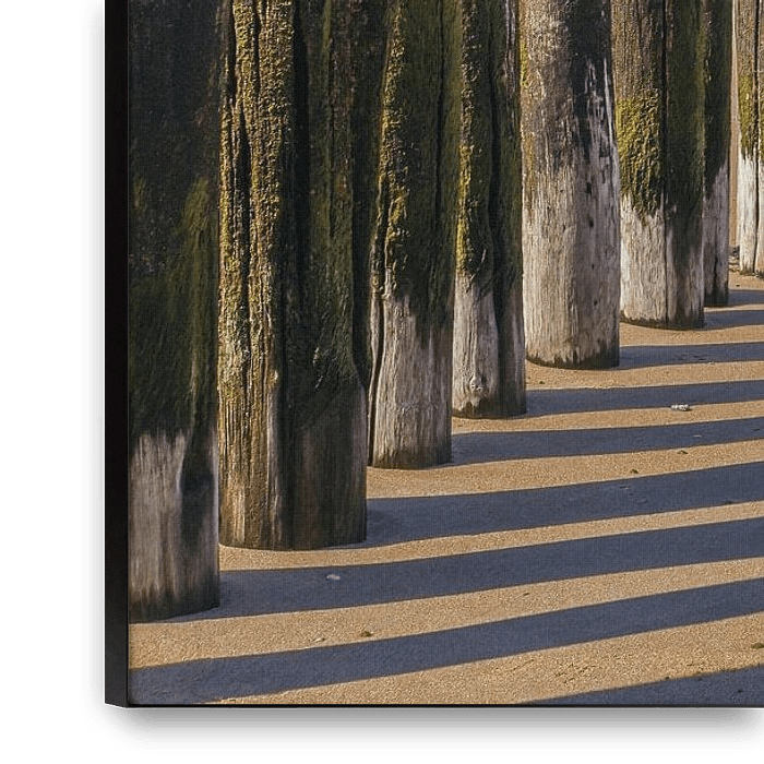 Cette impression vous ramène sur les plages d'été de Zeeland, où des rangées de brise-lames ou de têtes de pieux canalisent élégamment l'eau et le sable. Les poteaux en bois forment un jeu de lignes graphique qui s'intègre parfaitement à l'horizon calme, sous un ciel bleu limpide. La composition minimaliste met l'accent sur la…