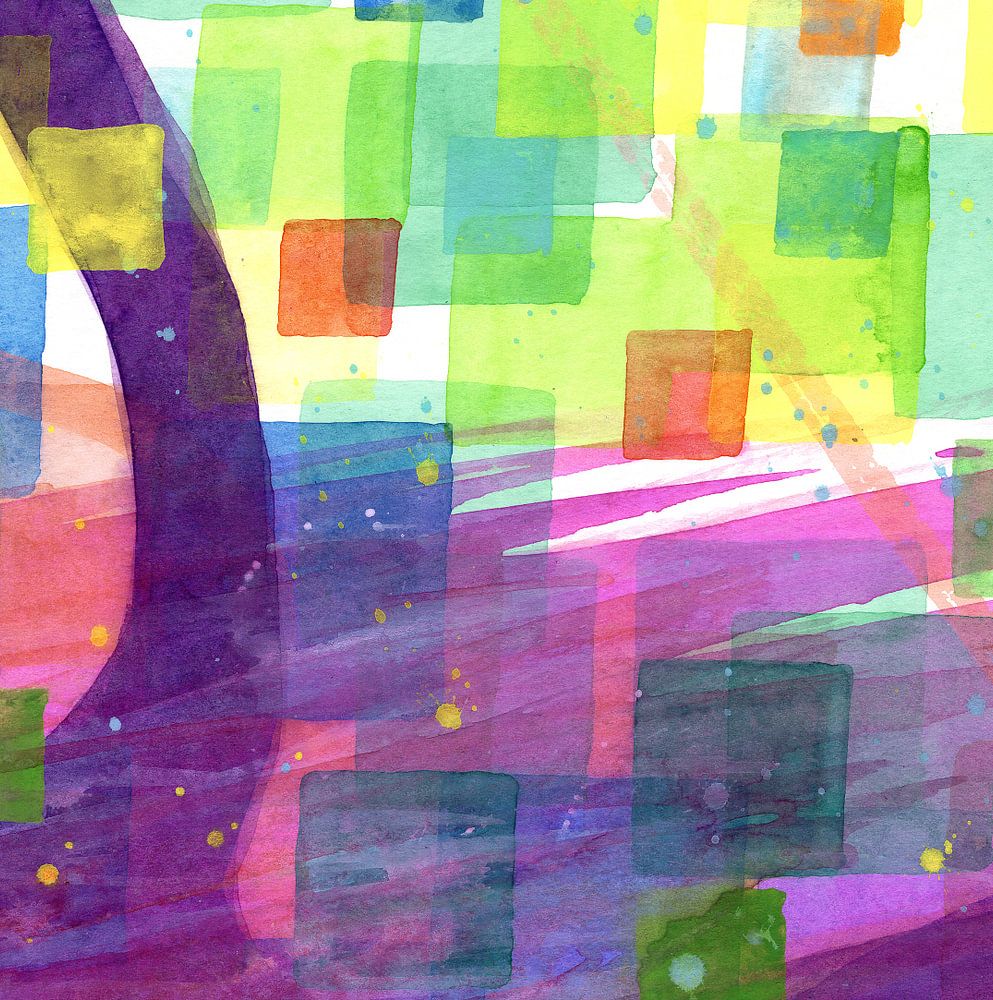 This is a combination of rhythmic squares combined with several free forms like a bend, a splash and a line. It's a work about the harmonic combination of opposites: Dark and light; dynamic and calm, yin and yang. The lower part of the image is immersed in a pink tone whereas the upper part remained untainted.