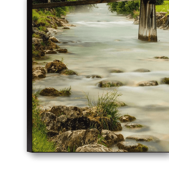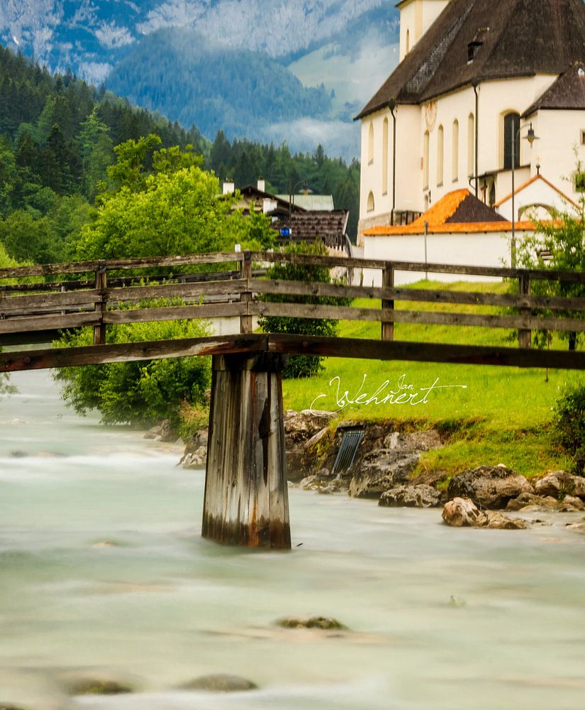 Berchtesgaden Ramsau Église paroissiale de Saint-Sébastien - vue longue exposition sur une rivière avec pont en bois