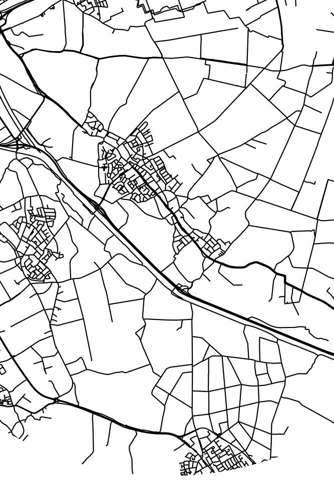 Carte en noir et blanc, carte des rues ou plan des rues de Berlicum. Berlicum est situé dans la municipalité de Sint-Michielsgestel, dans la province de Noord-Brabant. Toutes les routes publiques de Berlicum sont indiquées sur la carte de la ville. En outre, la carte est fournie avec les coordonnées du centre de Berlicum.