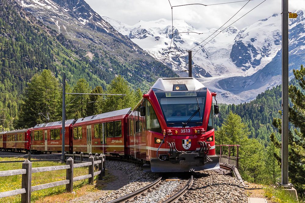 Bernina Express des Chemins de fer rhétiques devant le glacier de Morteratsch au col de la Bernina dans les Grisons, en Suisse.