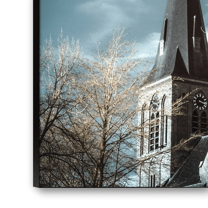 L'église Sint Lambertus à Beers, dans le Brabant septentrional. Cette photo a été prise avec un appareil photo modifié qui ne détecte que la lumière infrarouge. Lors du post-traitement, l'image infrarouge a été reconvertie en une image couleur, appelée "fausse couleur", infrarouge. Cela donne à la lumière des couleurs aliénantes et une atmosphère distincte à l'image.