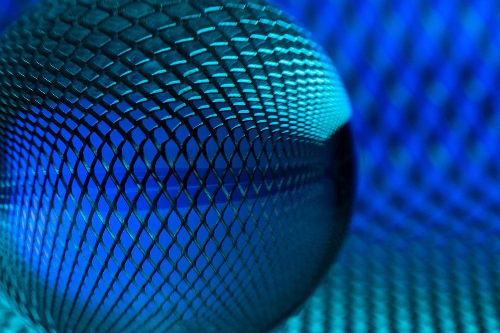 Réflexion d'une grille métallique dans une sphère de verre.