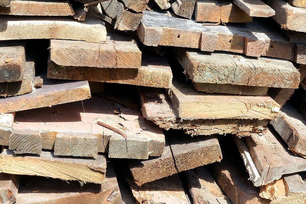Bois de chauffage empilé, composé de planches et de poutres provenant de déchets de démolition d'une ancienne maison, en grand tas, pour chauffer une cheminée ou un poêle en hiver.