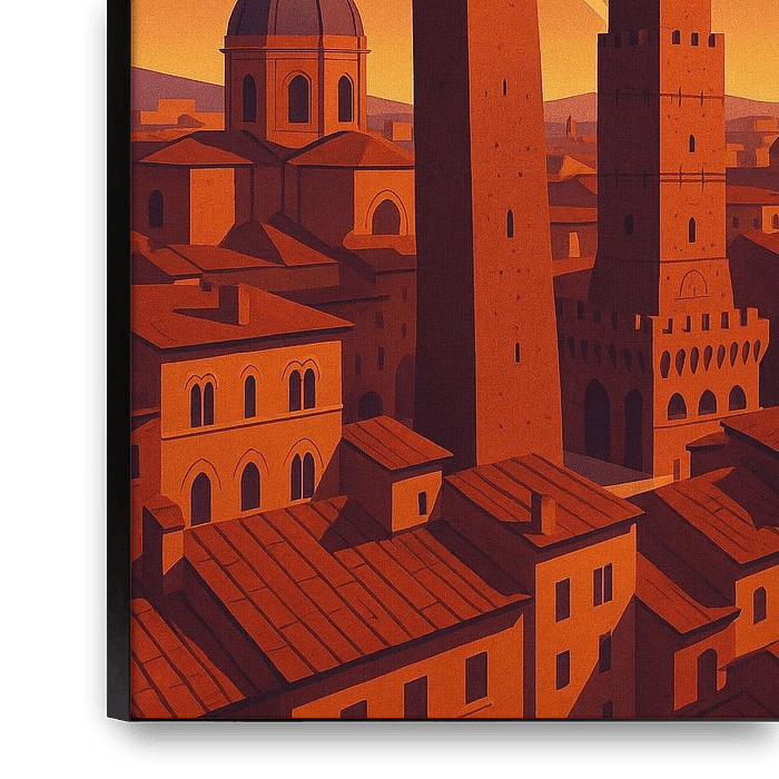 Achetez cette œuvre d'art Art déco Bologna Art Deco Poster - Two Towers Vintage Print par Travel Shop sur toile, aluminium, ArtFrame ou photographie (encadrée), impression d'art en haute qualité et tout format.