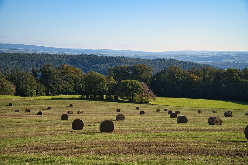 Bottes de paille dans un champ de blé récolté. L'approvisionnement en nourriture. L'agriculture pour nourrir l'humanité. Photo de paysage prise dans la nature.