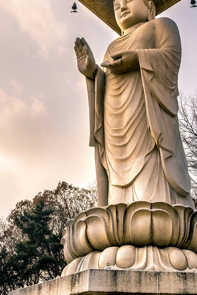 Statue de Bouddha dans le complexe du temple Bongeunsa à Séoul, Corée du Sud. Pendant une soirée d'hiver ensoleillée avec la lumière du soir qui brille sur le Bouddha.