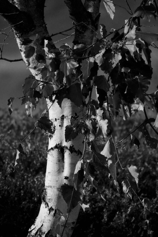 Prise de vue en noir et blanc, très contrastée, d'un bouleau tendre dont l'écorce blanche caractéristique est éclairée par le soleil.