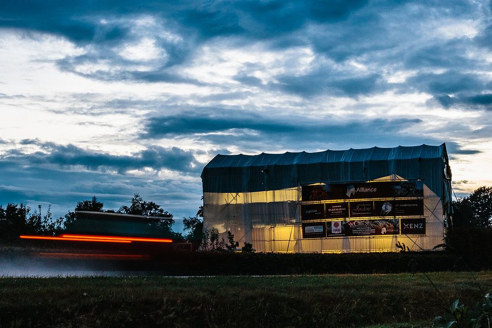 De bouwtent van een corsogroep in de avond terwijl donkere wolken voorbij trekken. Een auto passeert.