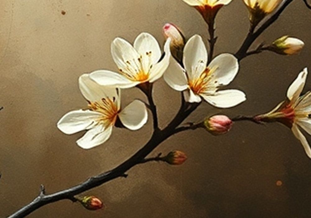 branche de magnolia sur fond mixte marron gris blanc minimalisme style japandi.