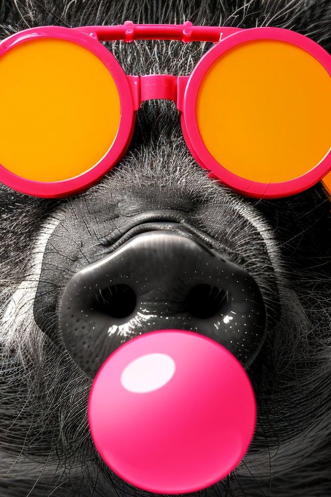 L'animal est représenté avec une touche humaine, marquée par une paire de lunettes rondes et roses qui forment un contraste amusant avec son expression sérieuse. Le point central de ce portrait est la boule de chewing-gum rose qui vient d'être gonflée et semble flotter entre le museau de l'animal et le spectateur. Cet élément ludique, associé aux couleurs vives et à la texture détaillée de la fourrure de l'animal, confère à l'œuvre d'art un caractère contemporain et excentrique.