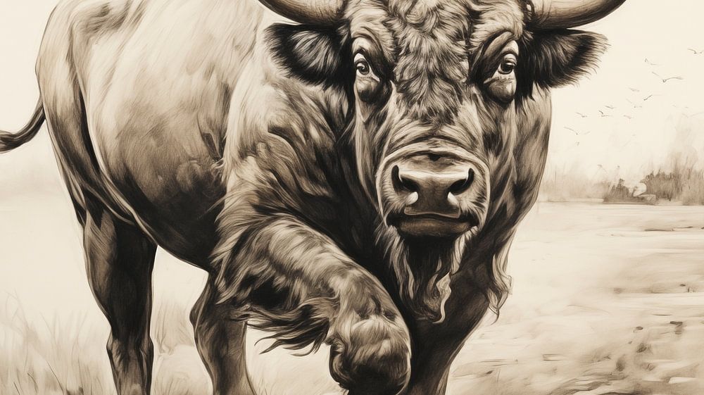 Buffle courant dans un champ, dessin, dessin au crayon de buffle de style vintage.