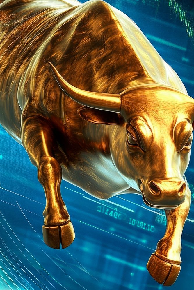 Un puissant taureau doré perce avec une dynamique inéluctable un paysage numérique qui s'anime avec des courbes financières ascendantes. Cette représentation pleine d'énergie symbolise la force et la croissance, idéale pour un bureau où l'inspiration et l'esprit d'entreprise sont encouragés. Un accroche-regard qui respire la motivation et la détermination !