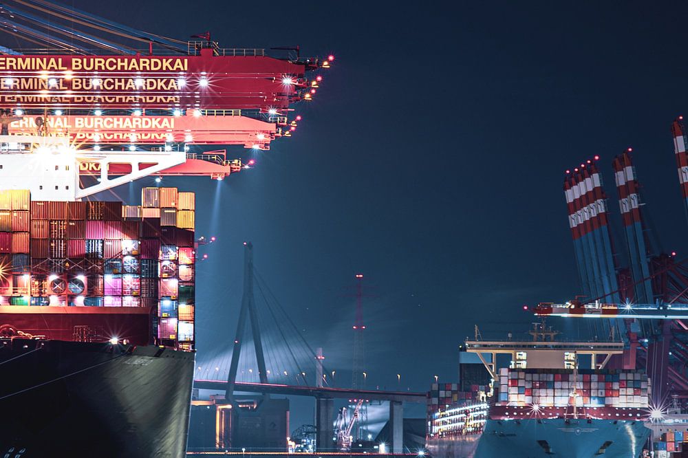 Le célèbre Burchardkai dans le port de Hambourg avec le pont Kölbrand en arrière-plan.