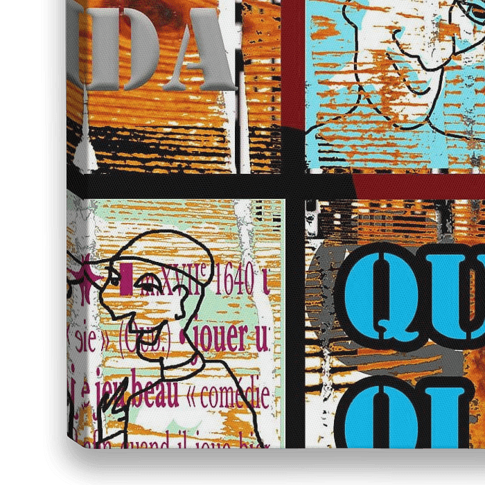 Soit. Collant ? Quoi ? Un collage de Marijke Mulder. Composé de toutes sortes d'œuvres d'art distinctes. Des portraits, des figures fantastiques, des textes, des fleurs, une empreinte de mains sales, un point d'interrogation. Impression sur bois. J'ai fait un peu de pression ici et là. Le grain est visible. Vieilli, usé. Je combine tout dans un collage : des photos, des dessins, des croquis, des peintures, des morceaux d'aquarelle, du papier quadrillé, des coupures de patrons de couture, des coupures de journaux, des bouts de textes français de magazines, etc. Je réalise le collage en fouillant dans mes archives accumulées au fil des ans. Le collage se fait par étapes. Sur le chevalet, sur la planche à dessin, photographié et divisé à nouveau. La répétition des gestes, la pesée du résultat, la prise de distance et le fait de ne rien faire avec pendant quelques jours, puis de retravailler parce que l'image se forme soudainement et l'œuvre sort de vos mains comme si elle était toute seule. Inspiré par Picasso, Matisse, Asger Jorn, Keith Haring.