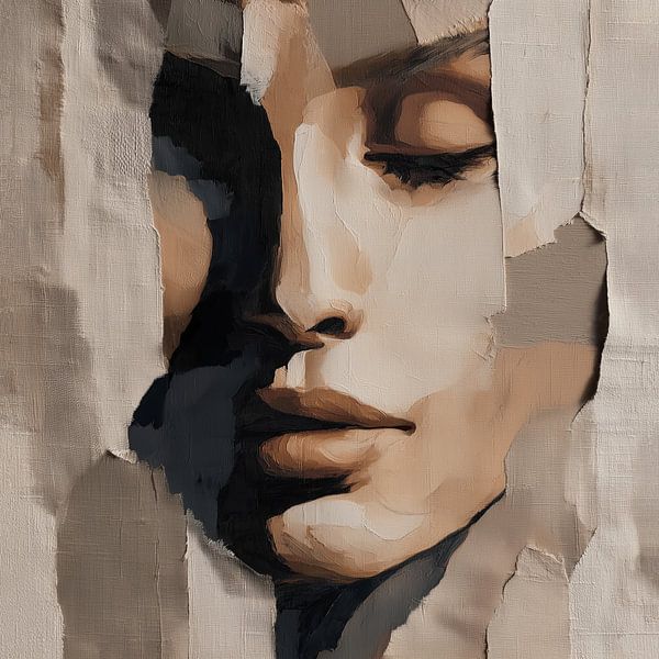 Ce qui rend l’œuvre particulière, c’est la manière dont le visage se décompose en fragments de lumière et d’ombre. Des teintes douces et crémeuses alternent avec des couleurs chaudes et terreuses et des ombres profondes. Ces contrastes créent une tension visuelle qui reste néanmoins équilibrée. On dirait que chaque fragment porte sa propre histoire, tout en formant ensemble un tout harmonieux.