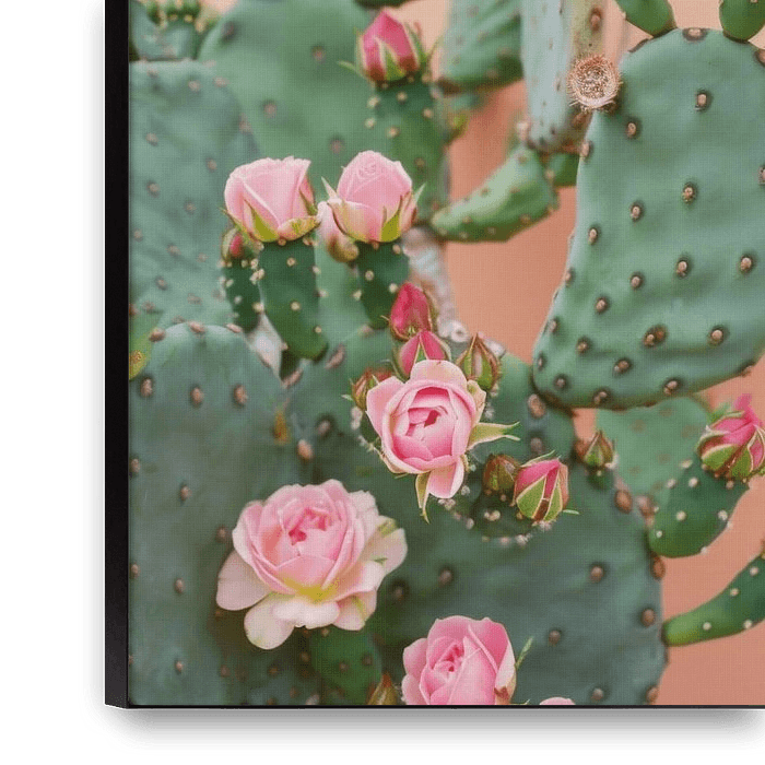 L'image montre un cactus en pleine floraison avec de délicates roses roses qui contrastent avec le corps vert épineux de la plante. Les fleurs et les bourgeons lumineux confèrent une douce élégance à cette plante robuste, tandis que le fond pastel complète harmonieusement la palette de couleurs. Une alliance fascinante de force et de…