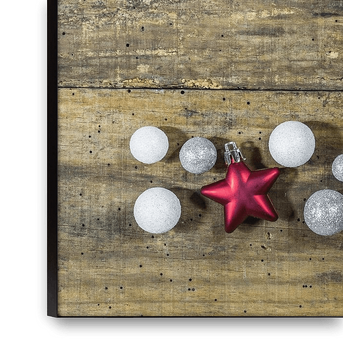 Cadre de décorations de Noël sur fond de bois avec boules et étoiles par Alex Winter