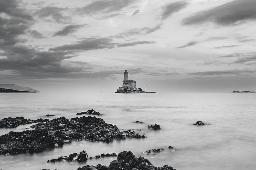 Un paysage dramatique en noir et blanc représentant le phare de Faro di Bocca, en Sardaigne, isolé dans une mer calme. La technique de l'exposition longue lisse l'eau en une texture semblable à celle du verre, contrastant magnifiquement avec les rochers déchiquetés du premier plan et les nuages texturés qui s'étendent à perte de vue.…