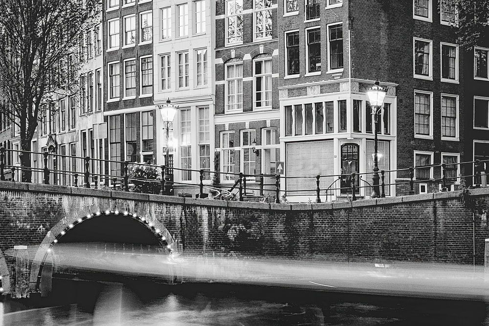 Des maisons historiques bordent le front de mer et des ponts arqués enjambent le canal serein, tandis qu'un bateau flou se déplace gracieusement sur l'eau, créant un contraste dynamique avec l'architecture immobile. Les tons noir et blanc renforcent l'atmosphère intemporelle de la scène.