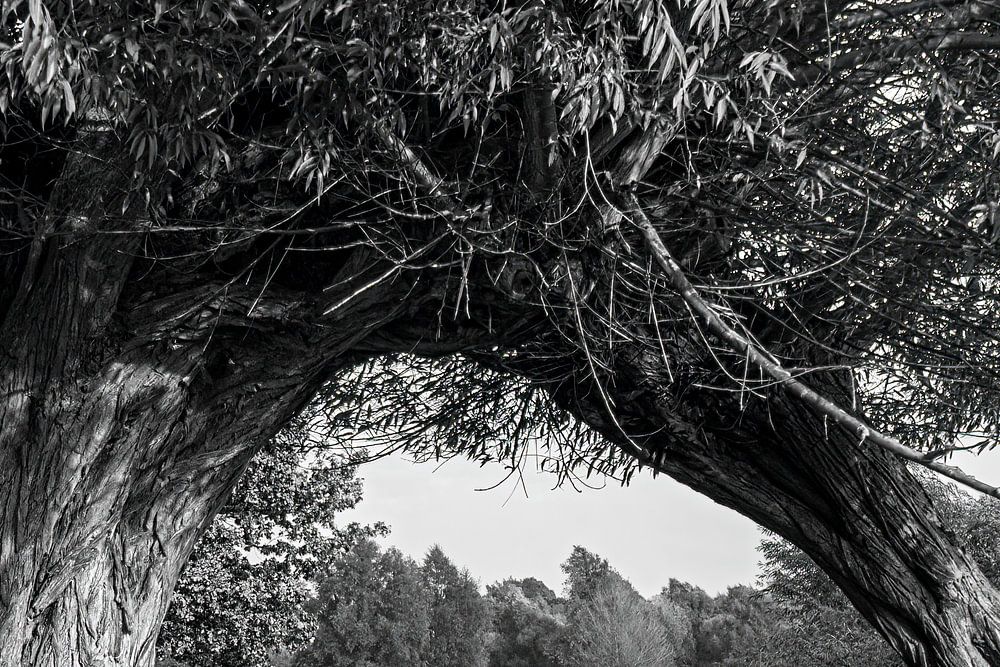 J'ai fait la conversion en noir et blanc principalement pour éviter que la couleur ne devienne le motif principal, alors que je pense que les textures doivent ressortir de la photo. La taille du format détermine ce que le spectateur peut voir. La structure des arbres est très belle et l'antiquité a laissé sa signature dans les troncs.
