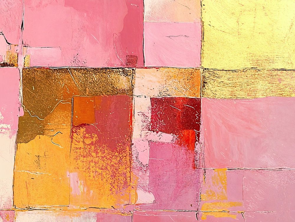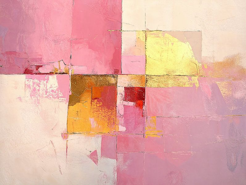 Carrés abstraits au pastel - Cette peinture abstraite présente une composition de carrés et de rectangles roses et jaunes atténués, avec des accents de rouge profond et d'or qui ajoutent de la vivacité et de l'énergie à la palette de couleurs apaisante.