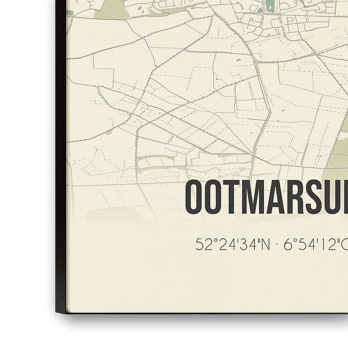 Carte rétro d'Ootmarsum, située à Twente, dans la commune de Dinkelland, province d'Overijssel. La carte montre les routes publiques, les cours d'eau (lacs, ruisseaux et fossés) et les forêts dans et autour d'Ootmarsum. En outre, la carte contient les coordonnées d'Ootmarsum.