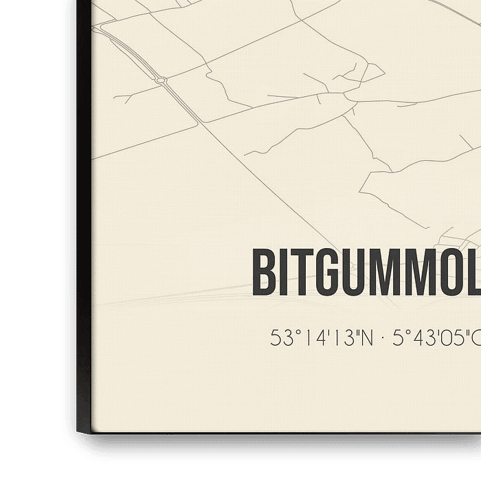 Carte rétro de Bitgummole, située dans la municipalité de Waadhoeke, province de Fryslan. La carte montre les routes publiques, les cours d'eau (lacs, ruisseaux et fossés) et les forêts dans et autour de Bitgummole. En outre, la carte contient les coordonnées de Bitgummole.