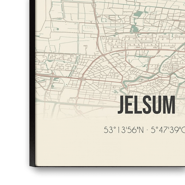 Carte rétro de Jelsum, située dans la commune de Leeuwarden, province de Fryslan. La carte montre les routes publiques, les cours d'eau (lacs, ruisseaux et fossés) et les forêts dans et autour de Jelsum. En outre, la carte contient les coordonnées de Jelsum.