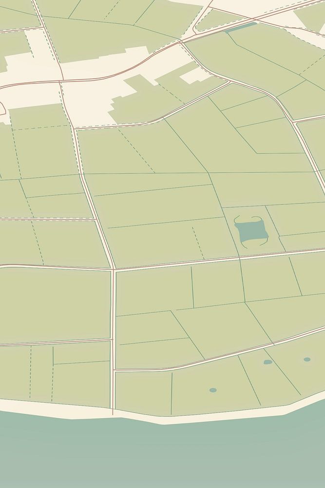 Carte rétro de Landerum, située sur les îles Wadden, dans la commune de Terschelling, province de Fryslan. La carte montre les routes publiques, les cours d'eau (lacs, ruisseaux et fossés) et les forêts dans et autour de Landerum. En outre, la carte contient les coordonnées de Landerum.